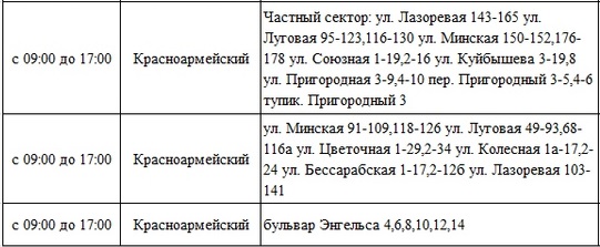На юге города электричества также не будет с 9.00 до 17.00. В Советском районе подачу ресурса ограничат на улице Голубятникова и улице Степной. А в Красноармейском придется побыть без света жителям следующих адресов: