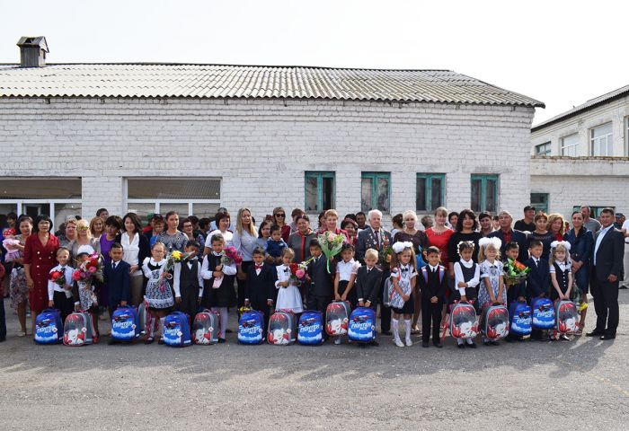 Первоклассникам подарили рюкзаки с набором канцелярских принадлежностей, а школе делегация презентовала промышленную мясорубку в столовую, несколько компьютеров и МФУ в учебные кабинеты, а также программное обеспечение для работы оргтехники.