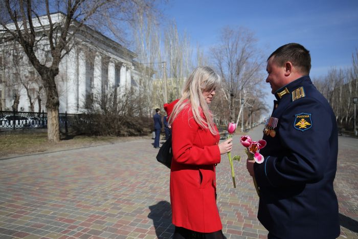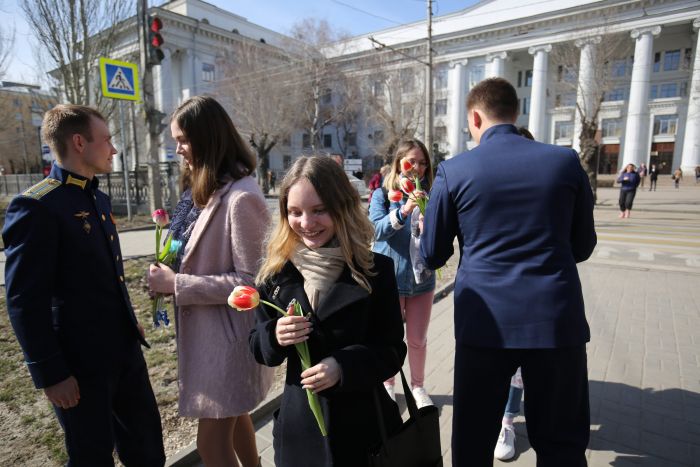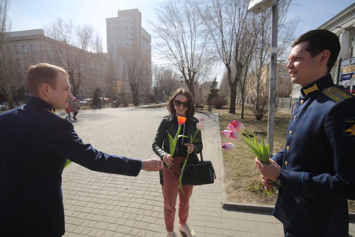 Чтобы поднять волгоградкам настроение накануне праздника, в областной центр из Калачевского района специально приехали летчики авиационного полка Южного военного округа. Одетые в парадную форму «цвета высокого неба», военные выбрали людное место – аллею, соединяющую технический и педагогический университеты.