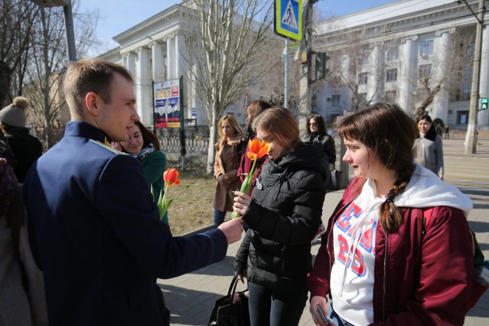 Спешащих на лекции и возвращающихся с занятий студенток ждали добрые пожелания и букеты весенних цветов. Девушки смущались, улыбались и, несомненно, были рады такому сюрпризу.