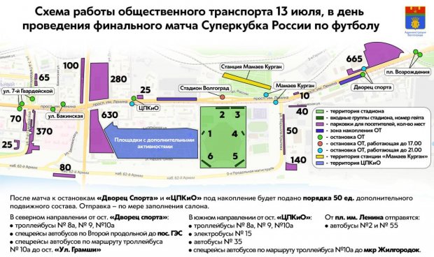 Как сообщили в администрации Волгограда, для удобства жителей и гостей города-героя в день проведения финального матча Суперкубка России по футболу общественный транспорт перейдет на усиленный режим работы.