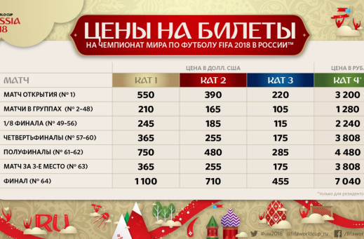 Кроме того, будут доступны билеты на игры мирового первенства по футболу ещё в трёх ценовых категориях. Первая – это места на центральных трибунах, вторая – на краях как центральных трибун, так и трибун за воротами, третья – в середине трибун за воротами. Минимальная цена в этом случае составит 105 долларов. Подробнее ознакомиться со стоимостью можно на таблице 1.