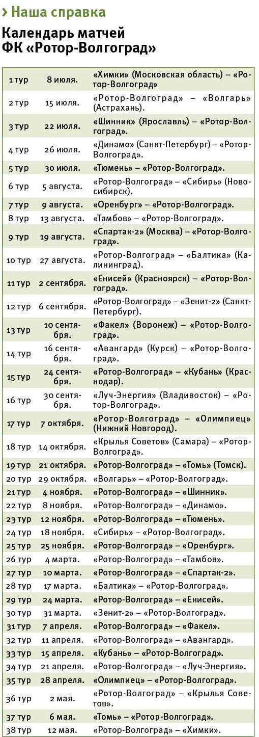 Первый матч «Ротор-Волгоград» проведет в Химках против одноименного клуба, почему‑то есть уверенность, что все у нашей команды сложится хорошо. Первый домашний матч состоится на стадионе «Зенит» 27 августа – наша команда будет принимать калининградскую «Балтику».