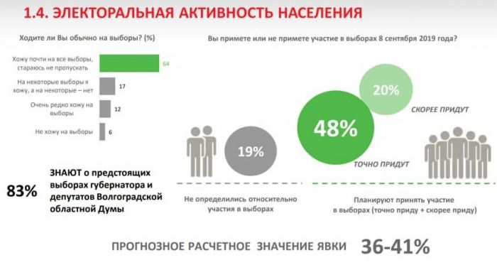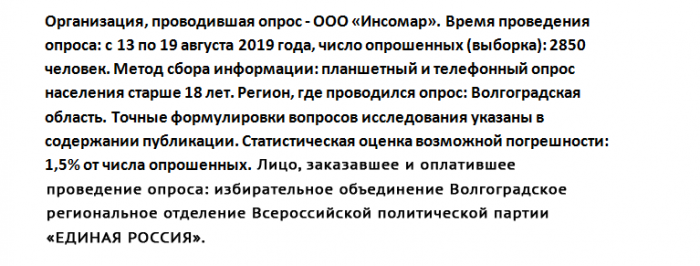 Специалисты крупной российской социологической компании «Инсомар» сообщили о предпочтениях избирателей Волгоградской области накануне выборов. Объем выборки составил 2850 опрошенных, соцопрос проводился во всех муниципалитетах региона с 13 по 19 августа.