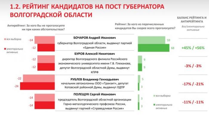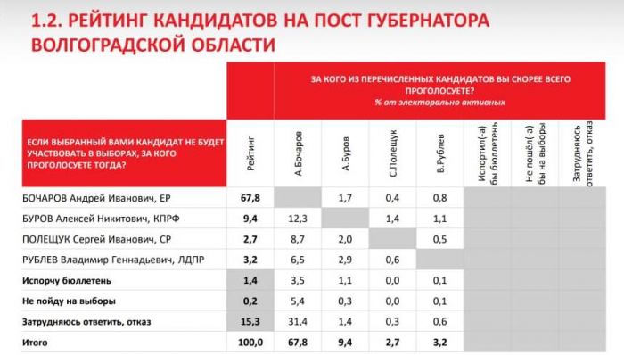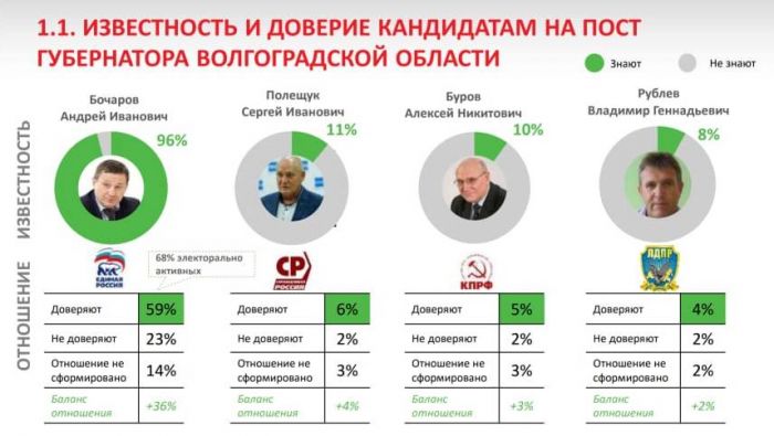 Установлено, что 68% жителей, планирующих голосовать в этот день, хотят отдать голоса за губернатора Волгоградской области Андрея Бочарова.