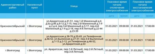 31 марта без света оказалась часть Краснооктябрьского района Волгограда. Как сообщила «Волгоградская правда.ру» со ссылкой на источник в ресурсоснабжающей организации, отключение связано с плановыми работами на сетях. Электричество планируют вернуть в 17.00.