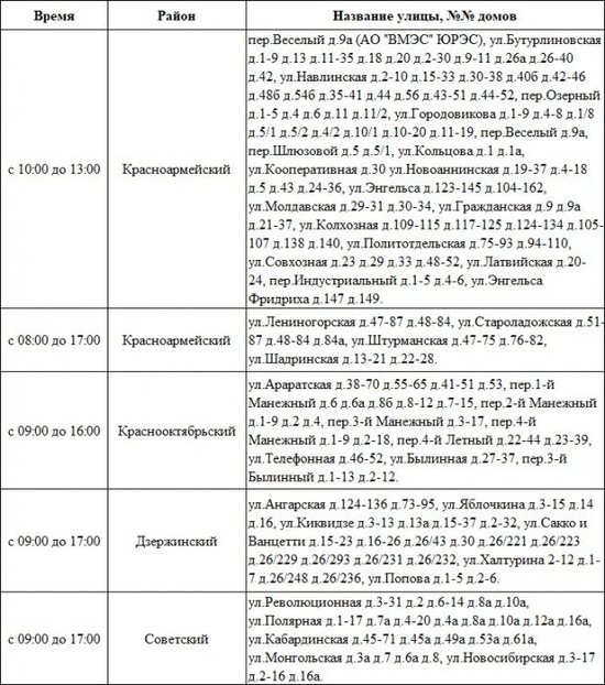 Полный перечень районных адресов и времени отключения света в графике ниже.