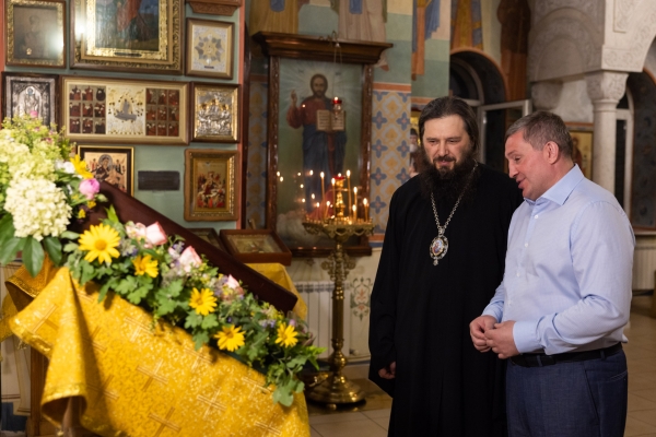 Митрополит Волгоградский и Камышинский Феодор и губернатор Андрей Бочаров первыми встретили святыню.