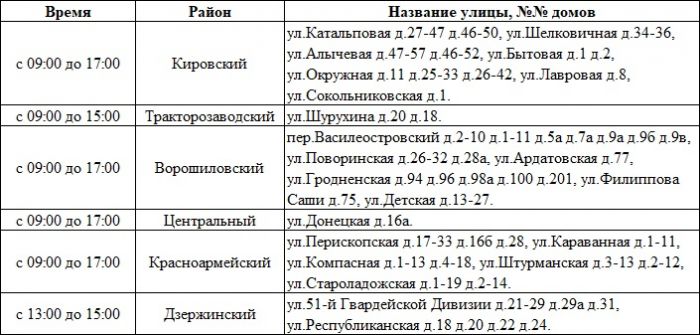 Как сообщает “Волгоградская правда.ру”, во вторник без ресурса останутся жители десятков домов. Отключение затронет Тракторозаводский, Центральный, Ворошиловский, Дзержинский, Кировский, Красноармейский районы города.