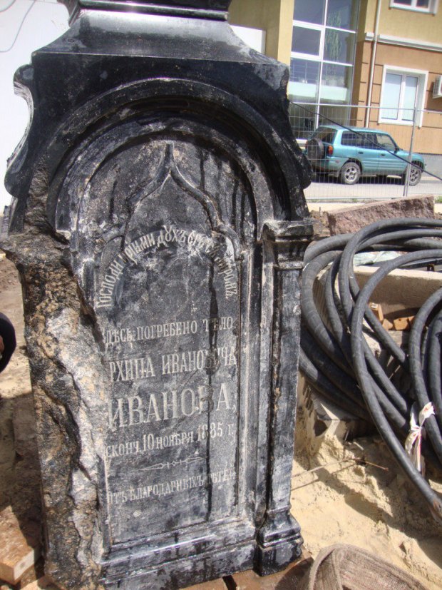 Старинный могильный памятник был обнаружен в строительном мусоре рядом с храмом Александра Невского на территории будущего сквера. В пресс-службе Волгоградской епархии уточнили, что памятник был установлен Архипу Ивановичу Иванову. Он умер 10 ноября 1885 г. Это был известный в Царицыне купец, который основал крупный торговый дом «Архип Иванов и сыновья». Также он был депутатом Царицынской думы начиная с 1871 года. Сыновей купца звали Василий, Алексей и Степан. Последний был в попечительской комиссии постройки собора.