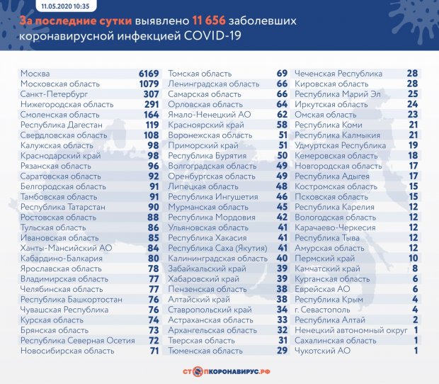 Данные о количестве заболевших в России опубликованы на сайте «Стопкоронавирус.рф» 11 мая.