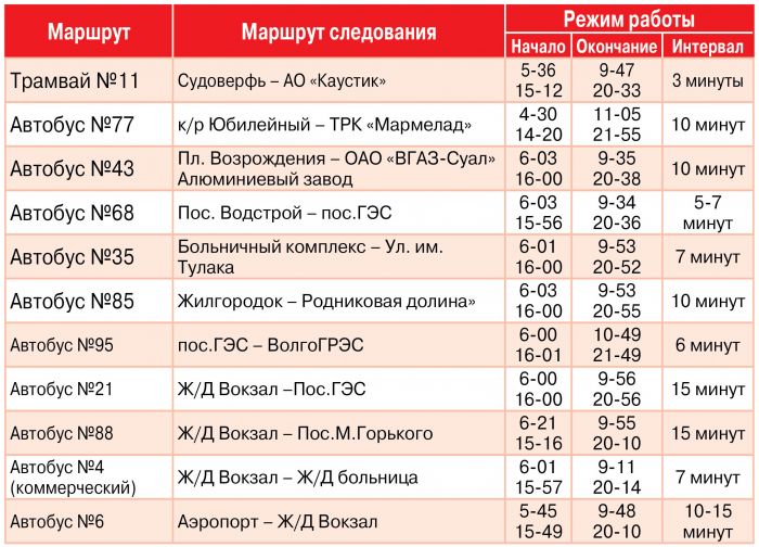 Автобусы и трамваи, которые будут возить до места работы тех, кто не может приостановить деятельность, станут курсировать с 6 до 9 часов утра, а также с 16 до 20 часов. Интервал движения составит от 3 до 15 минут. Остановки будут делаться на всех предусмотренных по ходу движения пунктах. Ниже представлено расписание движения: