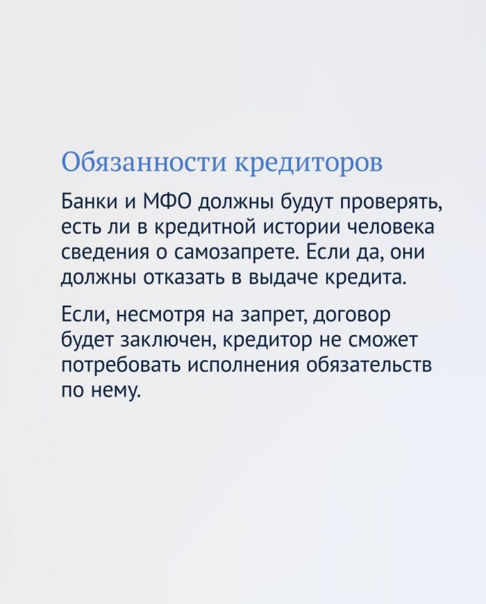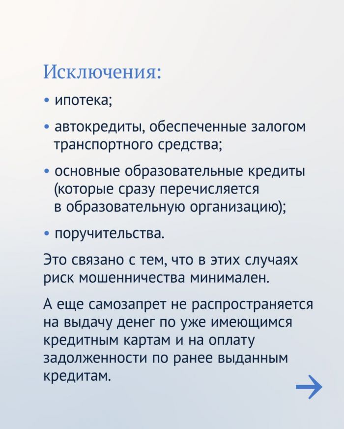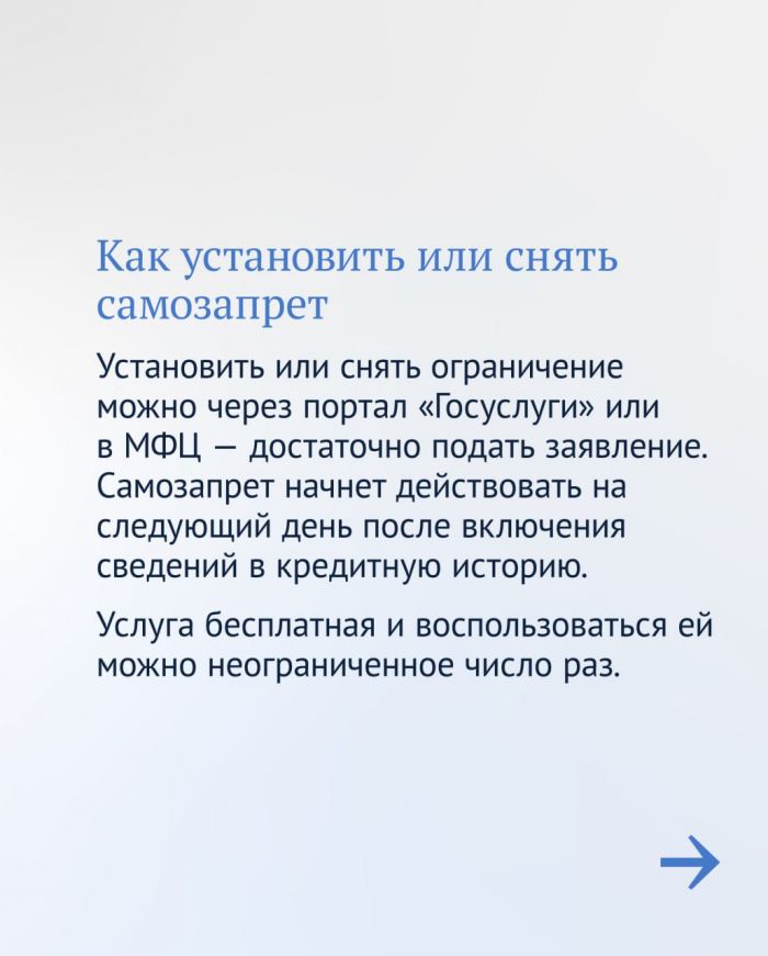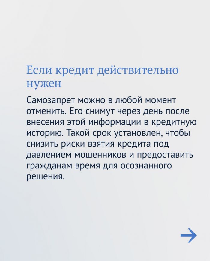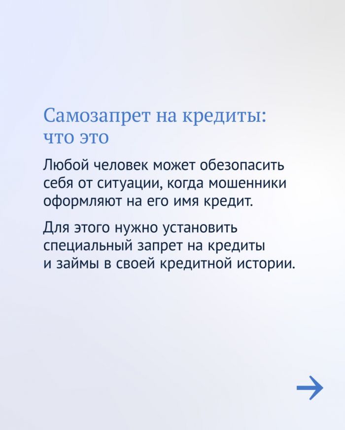 Самозапрет на оформление кредитов и займов можно установить на портале «Госуслуги». Это делается для того, чтобы злоумышленники не смогли взять кредиты на чужое имя. В телеграм-канале Государственной думы объяснили в карточках, как поставить ограничения, какие существуют исключения и что делать, если во время действия самозапрета возникла необходимость в кредите.