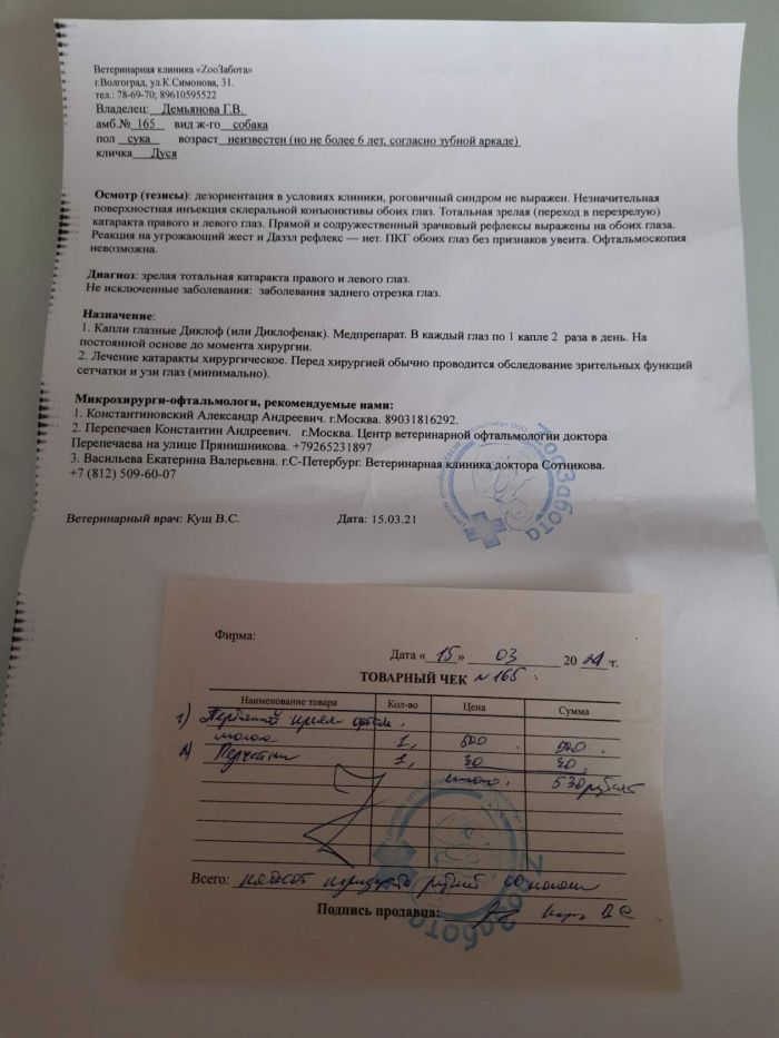 По словам Галины, после обследования Дусе поставили диагноз «зрелая тотальная катаракта правого и левого глаза; заболевание заднего отрезка глаз».
