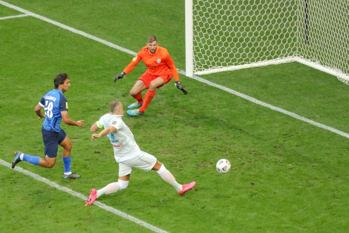 После этого «Зенит» полностью завладел инициативой, чувствовалось, что питерцы играют с большим запасом прочности и могут прибавить в любой момент. На 22-й минуте Себастьян Дриусси отобрал на левом фланге мяч у Антона Пискунова и прострелил во вратарскую, где Артему Дзюбе оставалось только подставить ногу.