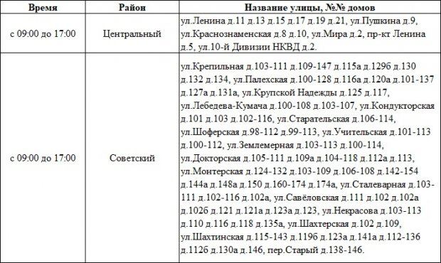 Ресурсоснабжающая организация разместила на своем портале график и адреса отключений. Так, без электроэнергии на 8 часов останутся жители Центрального и Советского районов.